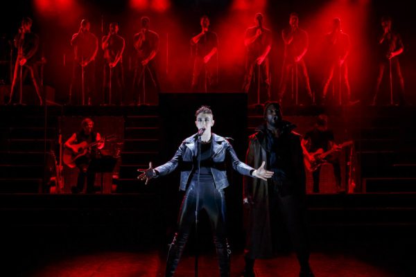 …Yes? And? Joan of Arc: Into the Fire gives us nothing new to consider in its retreading of this old story. It presumes the relevance and importance of its own material without doing any work to show us that relevance, to create a revelation in its audience as to why this story might in fact matter now. We are simply told that it does. The play seems to think it’s doing enough simply by putting a woman with a mic in her hand at center stage — oh, and of course by hoisting a banner that makes reference to a fashionable piece of contemporary politics. Truly, it’s all about that banner: hanging there in all its Instagrammable glory, its purpose seems to be to absolve Joan of Arc’s creators of all artistic and political rigor for the next ninety minutes. The correct progressive box has been checked, we can all feel very good about ourselves, and the show can go on. The haze of self-righteousness is thick in the theater: if you walk out in anything less than a state of liberal rapture, well, that’s your own fault.