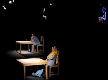 The lights come up, and we see a woman and a man in their 30s/40s (Hassan Madjooni and Mahin Sadri, who are both phenomenal). They, too, are sitting at tables, but now the image has been deconstructed – it is as if the long table from Dances On Glasses has been snapped in half, and the people, who in Dances sat in profile, now face us directly. The lighting suggests they are in separate chambers, though they talk as if they are sitting right across from each other.