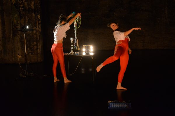 HIJACK’s More Fast Talkin’ mixes jankiness with elegance. The combination is clearest in the costume design: red unitards and white crop tops with the tags still on. The choreography is rigorous and specific, with notes of Cunningham. Tightly controlled moves unspool in quick succession. Arwen Wilder moves quickly into and out of the floor before balancing and stirring an imaginary bowl on her hip, then leaning back. Kristin Van Loon hits her back attitudes and jumps with fastidious precision.