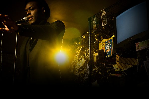 Ronald Peet is the ringmaster of Icarus, an Emcee who also plays all the dozens of parts in the poem. Icarus, having seemingly learned the lessons of his doomed helio-proximal journey, has somehow procured some swank digs in NYC surrounded by the entirety of his mythological cohort. His new path is poetry. And what kind of a poet is Icarus? He seems to be a haphazard one at best, winning an open mic night after improvising a ridiculous haiku (which somehow has 8 syllables in the middle line) and fainting on stage. This is no epic Greek hero. Ultimately, the character invoked is an everyman Icarus, one who has plunged into the teeming mass of bohemian New York. This is where my exegesis began to take shape. My first thought was of the first Daniel Craig Bond movie Casino Royale. Ostensibly showing the beginning of 007’s illustrious career, the blonde Bond makes more than a few mistakes on his way to achieving his goal. The beauty of this reboot was the opportunity to see an almost all-powerful character stumble his way to greatness. Perhaps our Icarus is taking a similar route? But let’s get back to the show for a moment.