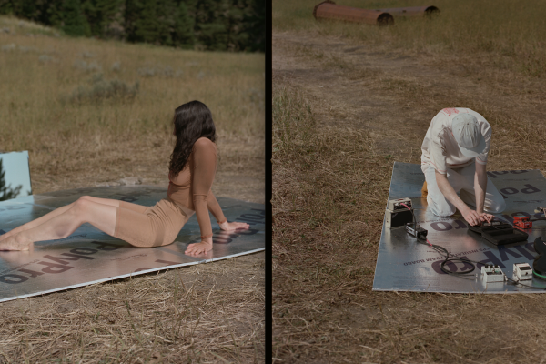 And then, time reversed itself. DEVOTION DEVOTION, an experimental meditation on collective authorship and agency, last seen at Exponential Festival in January of 2020, resurfaced. Two videos played simultaneously, shifting focus from artist to artist with restless intensity. Lydia Mokdessi, Jason Bartell, and Syd Island triangulated a slow-burning score of sonic and physical droning — this time, in a pine-fringed clearing somehow idyllic and sinister, a site for a vacation or a crime scene. Lydia, framed by two long mirrors, lay on a square of silver in the dead grass and moved in tiny increments towards postures oscillating between sexy and uncanny. Jason twiddled mysterious electronics that emitted pulsating hums beside her, clad in all white. Syd’s vocals dripped in from offscreen, adding a balancing touch of distinct humanity with lush ooo’s and aaa’s. The trio still worked like a mobius strip, with no leader and no edges. In this iteration, though, the ideas and bodies had space. The work seemed weirder, thicker, deeper; not every movement piece lends itself to film, but DEVOTION DEVOTION only thrived under the camera. Drone, they theorized again and more thoroughly, engages with indulgence and discipline at the same time — or perhaps the discipline and the indulgence warp into each other the way the videos merge and split. The line between desire and monotony blurred into the fuzz of looping synths. The mirrors reflected mountains in the distance. Maybe this is the drone: the landscape not yet seen but always arriving.