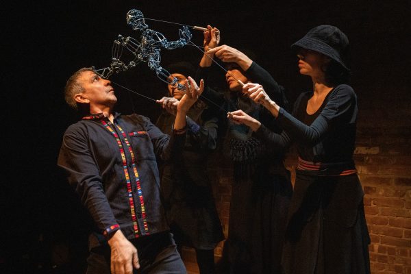 Dancing to a recording of his own voice, the story of Aunt Sonia’s (referred to as Tía Sonia) last day on earth began. Moving from one end of the stage to the other, Restrepo’s movement was precise and intriguing. The choreography was large enough to capture the audience’s attention and fill the space without being overpowering; then, the puppets arrived. The first one to grace the stage was a small, metallic blue, wire-like figure. It only took a moment to bring the object to life, and the dancing between the puppeteer and the marionette was seamless. So much so it seemed as if they were one person. A distinction between the two was only present when the choreography shifted from the dancer and the puppet moving in unison to them performing as a duet. In these moments, the bodies of both the dancer and the marionette began to engage in a dialogue. Each conversation was unique in its subject matter but key to understanding the life of Tía Sonia and her decision to end her life via euthanasia.