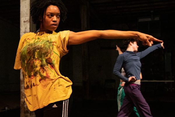 Wendell Gray II’s The People Show also goes “inside baseball” on the artifice of the stage, but from a different angle. The trio, danced by Bria Bacon, Dominica Greene, and Rachel Gill with periodic interruptions and redirections by Gray dressed as a stage manager, is about pre-performance. In the dances very first moments, Greene enters looking queasy, about to vomit, then morphs through a range of other emotions. Joined by Bacon and Gill, they smile, grimace, and eventually break out into a jazzy routine of rhythmic lunges and head banging.