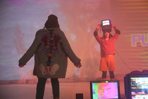 The monitors throughout the stage are supplemented by larger projections on the factory’s back wall. The screens often play the same visuals, a meandering and dated looking animated sequence created by Romania and Lena Hawkins. The projections are like cryptic karaoke, with Romania performing the words appearing on them mostly faithfully. The sound of his voice is distorted, lo-fi, and, of course, loud, channeling the energy of a monster truck rally announcer. There are a lot of words. The text spoken and projected ranges from cryptic, poetic rambling (“so like belief a fog a syllable a murmur it blinks”) to direct references to narrative or theme (“I’m tired of being a meteor of pain” and “If I can’t go out of my mind, where am I supposed to go?”) to something in the middle (“ennui ennui ennui hot dog”). The projections also feature Romania’s father, Arthur, dressed in a clown-like get up, musing on meditation and nature.