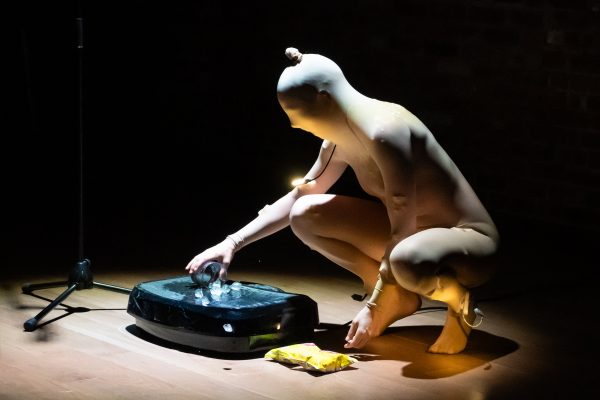 The first piece, Arantxa Araujo’s Cuerpos que Crujen: Huesos y Sabritas, opened from both ends: a door at the far end of the long stage opened and a figure in a head-to-toe black bodysuit slipped into the darkness, momentarily lit from behind. At the opposite end of the stage another unearthly figure appeared. Its skin was made of nylons pulled tautly over, and distorting, its face and body. It had a light, like an angler fish, protruding from its chest and two more from its shins. There was something beneath its “skin”; the creature pressed its hands against its own body and an amplified crispy crunching sound filled the space, ASMR-style. Potato chips!