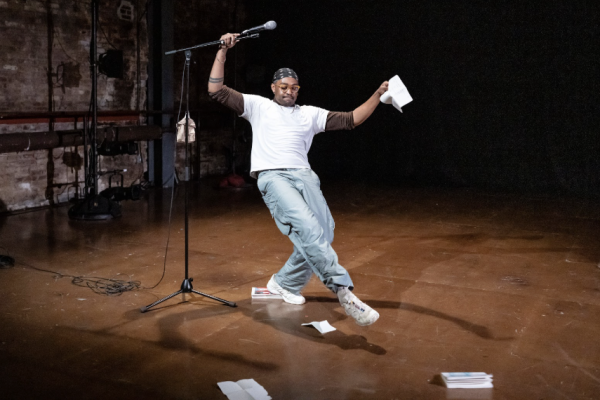 As he led us into his choreographic portal, Lloyd quickly made clear that we were operating on his timeline—a nonlinear, notably unhurried pace. At times, Lloyd’s gestures toward patience were subtle: the house lights progressively dimmed to narrow our field of vision and hone our focus. He slowly prepared his microphone height, donning reading glasses, putting up his hair, taking off his shoes and socks, and walking leisurely from one end of the stage to the other. At other points, Lloyd was more adamant in his directive to wait. His repeated gesture of an emphatic pointer finger aimed at the audience stands out—just hold on a moment. Wait. Look.