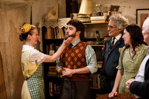 Inside BTCR there was the air of an early summer party: the door to the fire escape was open to let in the breeze, and a makeshift bar sold Modelos and seltzer. I had attended Matthew Gasda’s production of Anton Chekhov’s Uncle Vanya in January and now, last winter’s Russian dacha was transformed into a haphazard, idiosyncratically decorated 1930s Upper West Side apartment: A small bugle horn pinned to a wall, lace doilies on the furniture, a mask of Karl Marx, a vase with live goldfish swimming. Otherwise, the production design was stripped back. There is a refreshing informality at this venue, in part necessitated by the space itself. You have to walk through a kitchen to get to your seat, and there are no curtains separating the stage from the house: I was able to watch as a trio of actors—Emma Hart, Tomias Robinson, and Jakov Schwartzberg—warmed up in front of us, clustered around the piano singing. On the choice of venue, Emma Hart says, “We chose BCTR partly because the space already felt like a living room—it’s what the play needs. We didn’t have to build a whole set. And it adds a homey, welcoming atmosphere.”