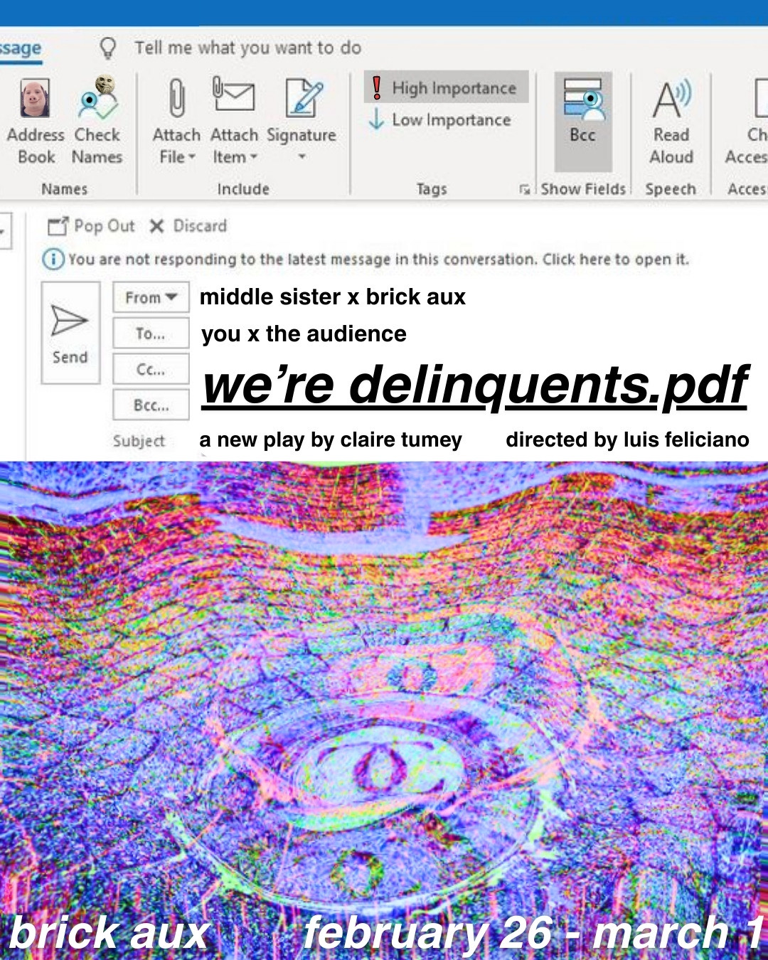 In we’re delinquents.pdf, by playwright and potential distant cousin of mine (see surnames) Claire Tumey, nothing is private and everything is sacred. All secrets—the party lives of young adults, their sexualities, their traumas—are rendered public knowledge. Every moment online and in life is “over and over announcing your place,” as Mary Oliver writes in “Wild Geese,” a poem mentioned in the play. All of this culminates in a cathartic humiliation ritual.